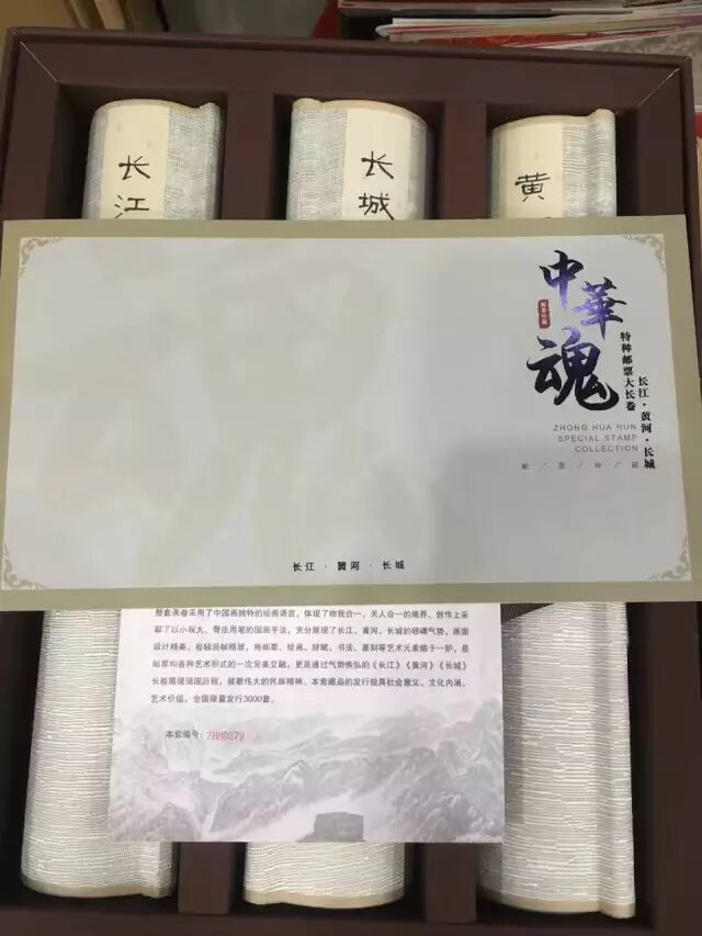 《中华魂》长江、黄河、长城邮票名家名作长卷画轴,是根据中国邮政2014年发行的《长江》、2015年发行的《黄河》、2016年发行的《长城》特种邮票制作而成,它是第一次采用九枚横连印制。整套画卷采用了中国画独特的绘画语言,体现了物我合一、天人合一的境界,创作上采取了以小观大、骨法用笔的国画手法,充分展现了长江、黄河、长城的磅礴气势,画面设计精美,卷轴装帧精致,将邮票、绘画、辞赋、书法、篆刻等元素熔于一炉,是邮票和各种艺术形式的一次完美交融,更是通过气势恢宏的《长江》《黄河》《长城》长卷展现强国历程,致敬伟大的民族精神。